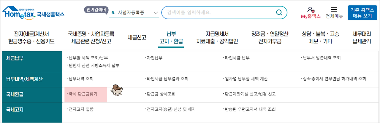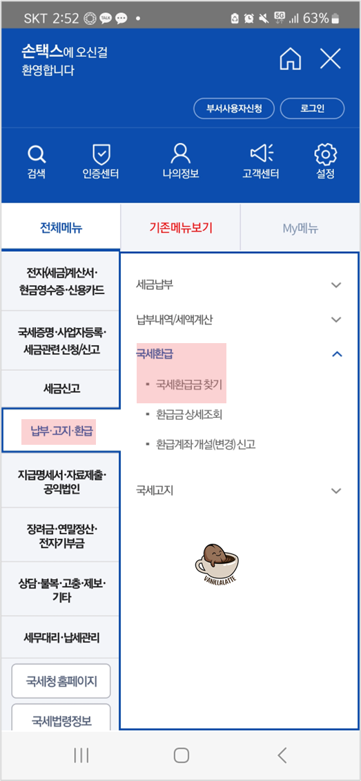 - '납부, 고지, 환급' > '국세 환급' > '국세 환급금 찾기'를 클릭해 조회합니다.
