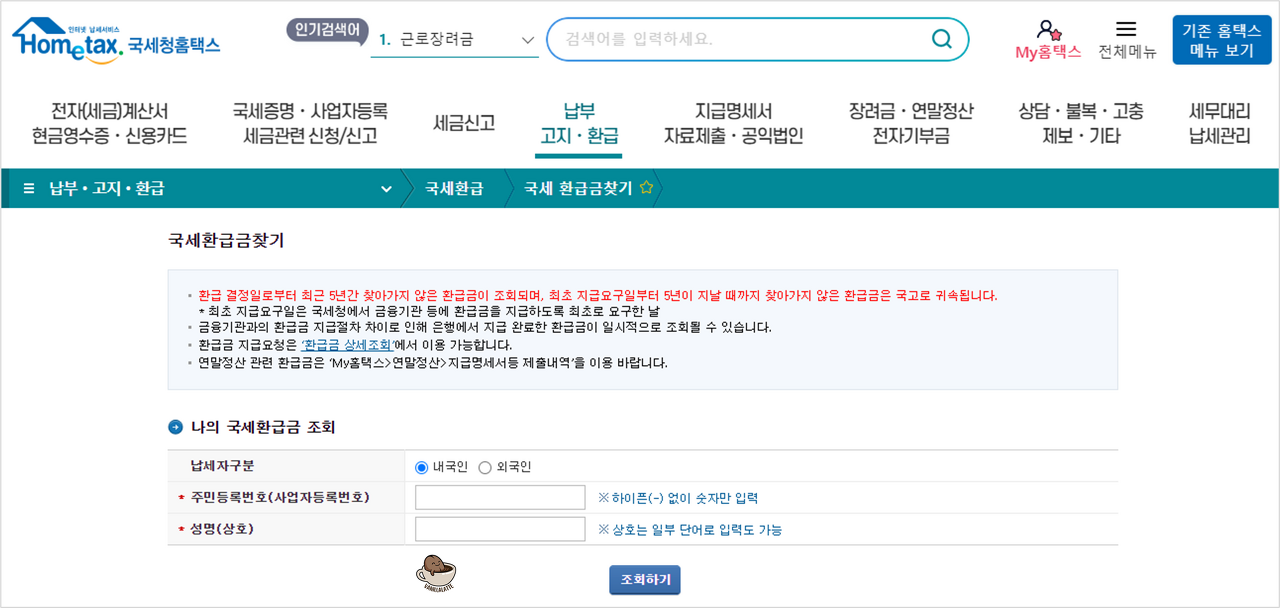 - 홈택스에 로그인 후 '국세 환급금 찾기' 메뉴에서 조회할 수 있습니다.
