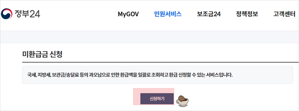 - 정부24에 로그인 후, 검색창에 '미환급금 신청'을 입력해 조회 및 신청할 수 있습니다.
