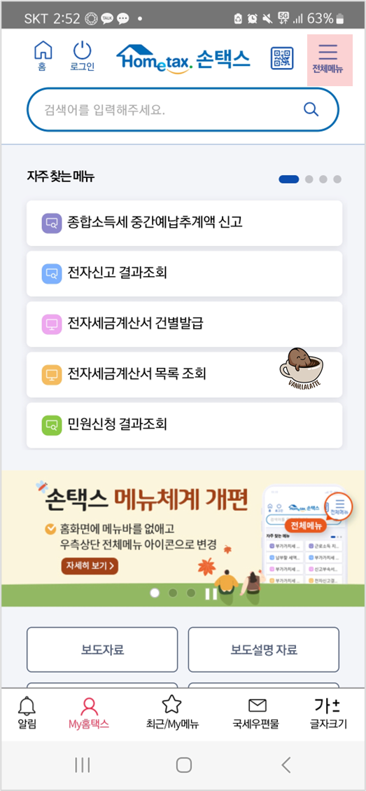 - 손택스 앱을 실행 후 '전체 메뉴'를 선택합니다.